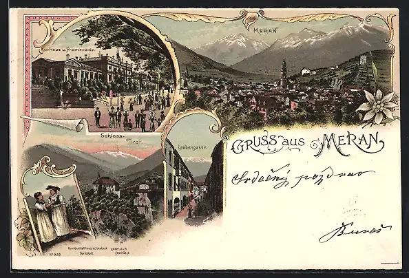 Lithographie Meran, Kurhau und Promenade, Schloss Tirol, Laubengasse