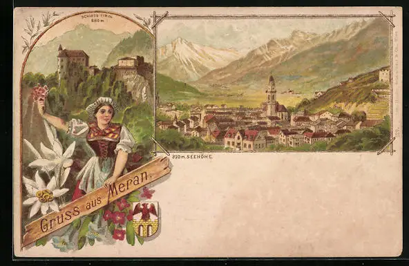 Lithographie Meran, Ortsansicht, Schloss Tirol