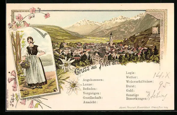 Lithographie Meran, Panorama, Frau mit Korb