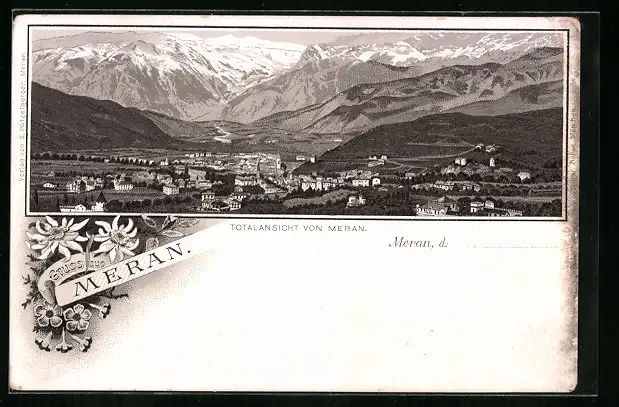 Lithographie Meran, Totalansicht mit Gebirgspanorama