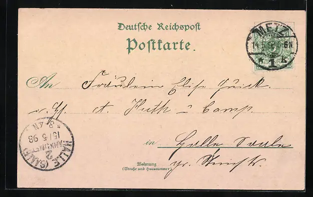 Personenbezogene Daten auf der Rückseite der Karte wurden durch blauen Textmarker unkenntlich gemacht. Die blauen Stellen sind auf die Vorderseite durchgeweicht und wirken sich negativ auf das Postkartenfoto aus