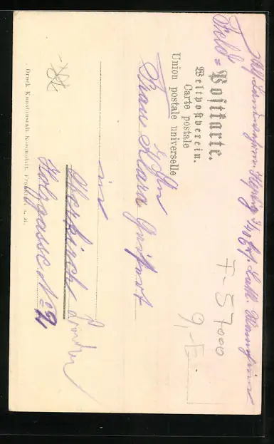 Personenbezogene Daten auf der Rückseite der Karte wurden durch blauen Textmarker unkenntlich gemacht. Die blauen Stellen sind auf die Vorderseite durchgeweicht und wirken sich negativ auf das Postkartenfoto aus