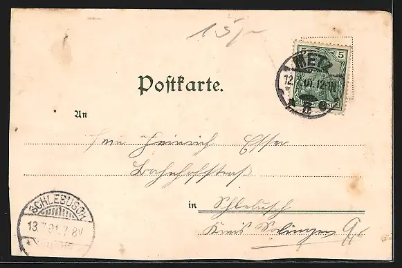 Personenbezogene Daten auf der Rückseite der Karte wurden durch blauen Textmarker unkenntlich gemacht. Die blauen Stellen sind auf die Vorderseite durchgeweicht und wirken sich negativ auf das Postkartenfoto aus