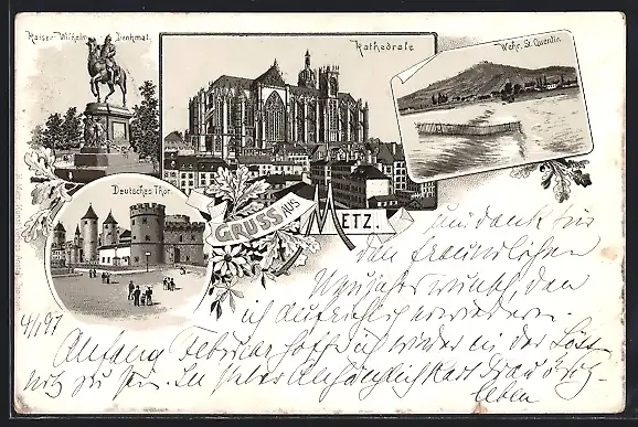 Lithographie Metz, Kaiser-Wilhelm-Denkmal, Kathedrale, Wehr St. Quentin, Deutsches Tor