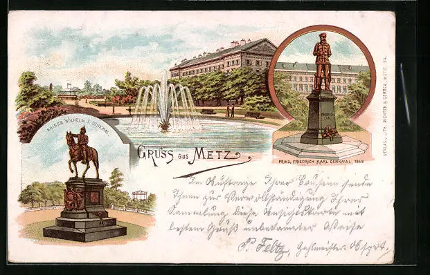 Lithographie Metz, Kaiser Wilhelm I. Denkmal, Springbrunnen