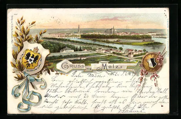 Lithographie Metz, Panoramablick auf die Stadt, Wappen