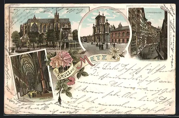 Lithographie Metz, Vinzenzkirche m. Lyceum, Gerbergraben