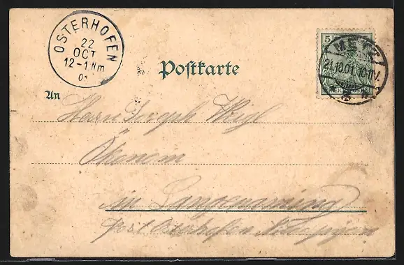 Personenbezogene Daten auf der Rückseite der Karte wurden durch blauen Textmarker unkenntlich gemacht. Die blauen Stellen sind auf die Vorderseite durchgeweicht und wirken sich negativ auf das Postkartenfoto aus