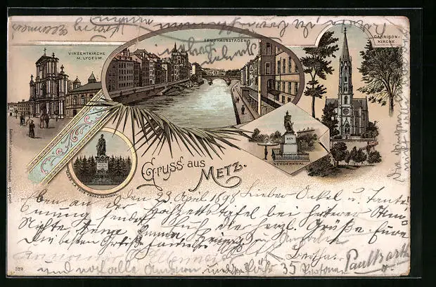 Lithographie Metz, Zeughausstaden, Garnisonkirche, Vinzentkirche mit Lyceum