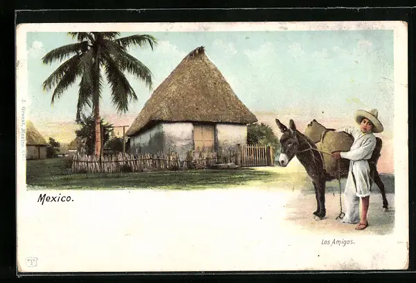 Lithographie Mexico, Los Amigos, Esel und Hütte