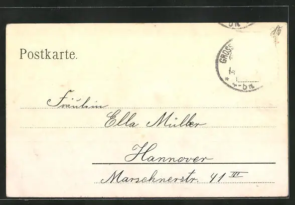 Personenbezogene Daten auf der Rückseite der Karte wurden durch blauen Textmarker unkenntlich gemacht. Die blauen Stellen sind auf die Vorderseite durchgeweicht und wirken sich negativ auf das Postkartenfoto aus