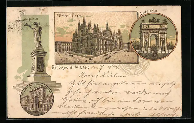 Lithographie Milano, Arco della Pace, Monumento a Mentana, Il Duomo di Finaco