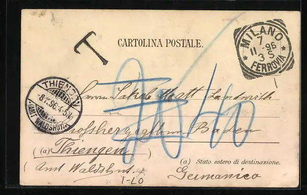 Personenbezogene Daten auf der Rückseite der Karte wurden durch blauen Textmarker unkenntlich gemacht. Die blauen Stellen sind auf die Vorderseite durchgeweicht und wirken sich negativ auf das Postkartenfoto aus