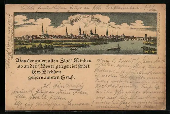 Lithographie Minden /Westf., Ruderboote vor dem Ort