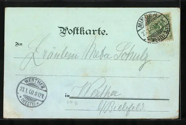 Personenbezogene Daten auf der Rückseite der Karte wurden durch blauen Textmarker unkenntlich gemacht. Die blauen Stellen sind auf die Vorderseite durchgeweicht und wirken sich negativ auf das Postkartenfoto aus