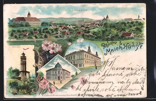 Lithographie Mnich. Hradiste, Rozhledna, Okresni dum, Divci Skola