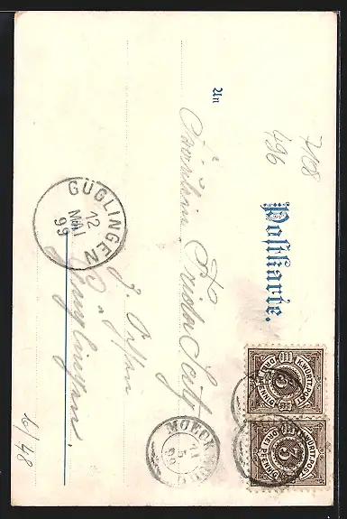 Personenbezogene Daten auf der Rückseite der Karte wurden durch blauen Textmarker unkenntlich gemacht. Die blauen Stellen sind auf die Vorderseite durchgeweicht und wirken sich negativ auf das Postkartenfoto aus