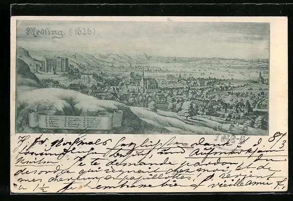 Personenbezogene Daten auf der Rückseite der Karte wurden durch blauen Textmarker unkenntlich gemacht. Die blauen Stellen sind auf die Vorderseite durchgeweicht und wirken sich negativ auf das Postkartenfoto aus