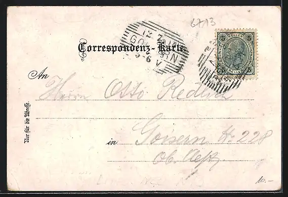 Personenbezogene Daten auf der Rückseite der Karte wurden durch blauen Textmarker unkenntlich gemacht. Die blauen Stellen sind auf die Vorderseite durchgeweicht und wirken sich negativ auf das Postkartenfoto aus