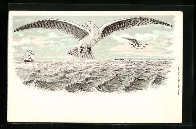 Lithographie Möwen über der Nordsee, Schiffe