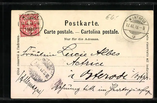 Personenbezogene Daten auf der Rückseite der Karte wurden durch blauen Textmarker unkenntlich gemacht. Die blauen Stellen sind auf die Vorderseite durchgeweicht und wirken sich negativ auf das Postkartenfoto aus