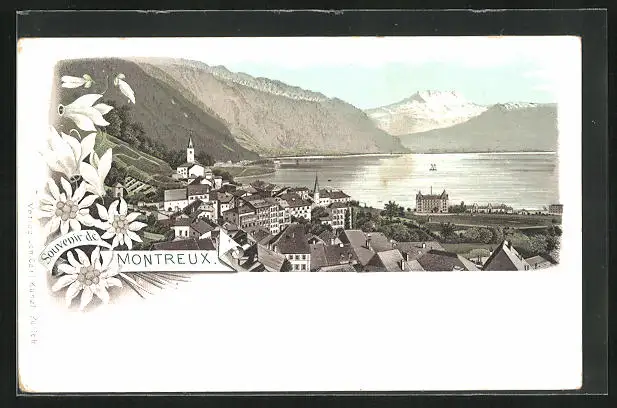 Lithographie Montreux, Panorama mit See