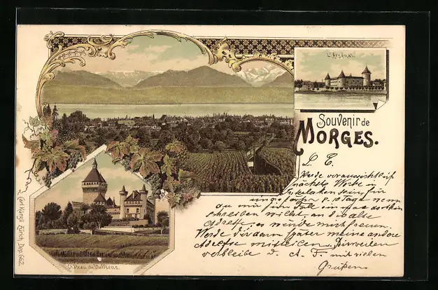 Lithographie Morges, L`arsenal, Weinberge, Chateau de Vufflens