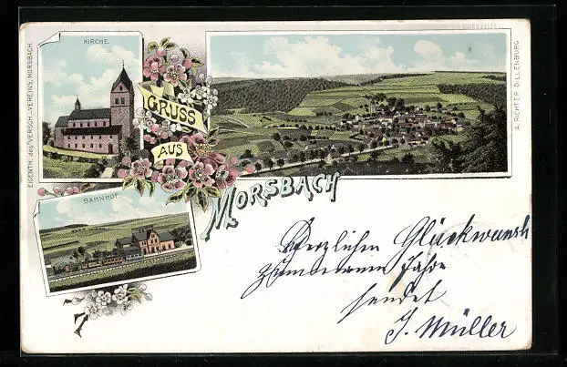 Lithographie Morsbach, Ortsansicht, Kirche, Bahnhof