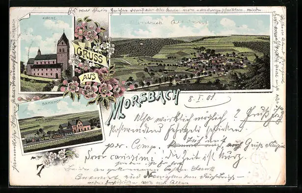 Lithographie Morsbach, Totalansicht, Kirche, Bahnhof