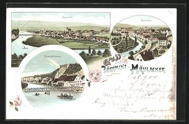 Lithographie Mühlacker, Teilansicht, Dürrmenz, Ruine Löffelstelz
