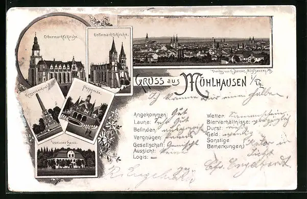 Lithographie Mühlhausen i. Th., Ortsansicht, Obermarktskirche, Untermarktskirche