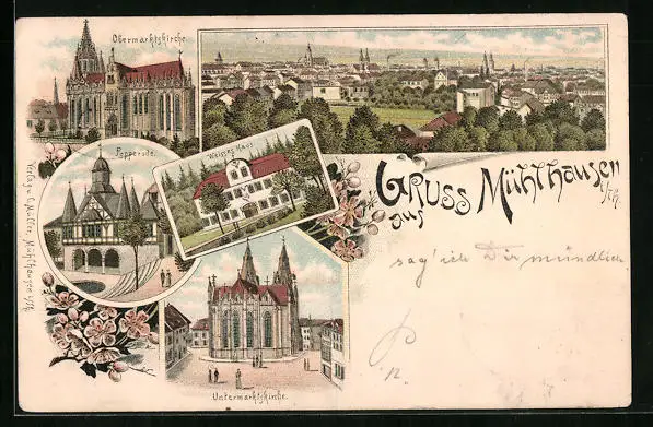 Lithographie Mühlhausen i. Th., Totalansicht, Obermarktskirche, Popperode, Untermarktskirche