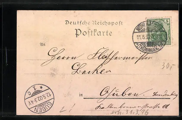 Personenbezogene Daten auf der Rückseite der Karte wurden durch blauen Textmarker unkenntlich gemacht. Die blauen Stellen sind auf die Vorderseite durchgeweicht und wirken sich negativ auf das Postkartenfoto aus