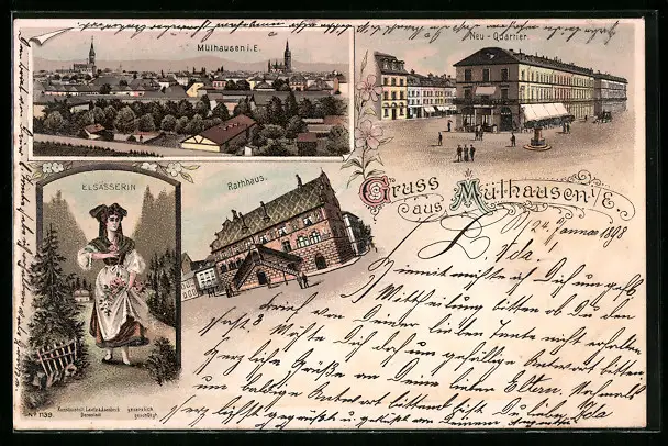 Lithographie Mülhausen i. E., Elsässerin in Tracht und Ortsansicht