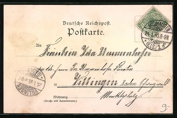 Personenbezogene Daten auf der Rückseite der Karte wurden durch blauen Textmarker unkenntlich gemacht. Die blauen Stellen sind auf die Vorderseite durchgeweicht und wirken sich negativ auf das Postkartenfoto aus
