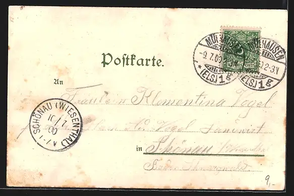 Personenbezogene Daten auf der Rückseite der Karte wurden durch blauen Textmarker unkenntlich gemacht. Die blauen Stellen sind auf die Vorderseite durchgeweicht und wirken sich negativ auf das Postkartenfoto aus