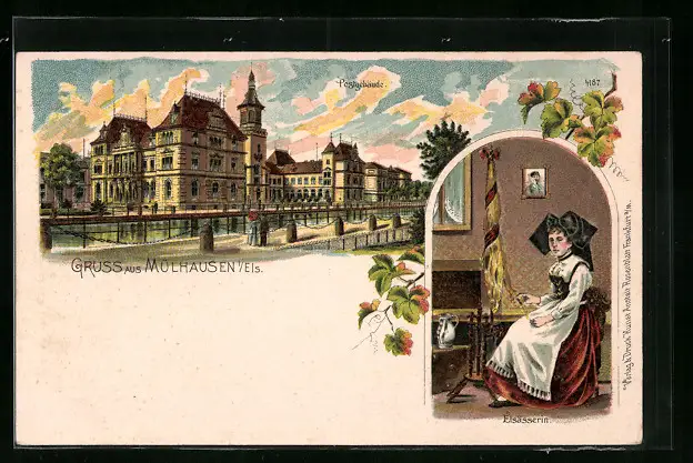 Lithographie Mülhausen i. E., Postgebäude und Elsässerin