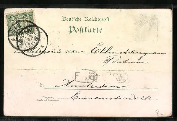 Personenbezogene Daten auf der Rückseite der Karte wurden durch blauen Textmarker unkenntlich gemacht. Die blauen Stellen sind auf die Vorderseite durchgeweicht und wirken sich negativ auf das Postkartenfoto aus