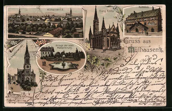 Lithographie Mülhausen i. Els., Totalansicht, Rathaus, Evang. Kirche