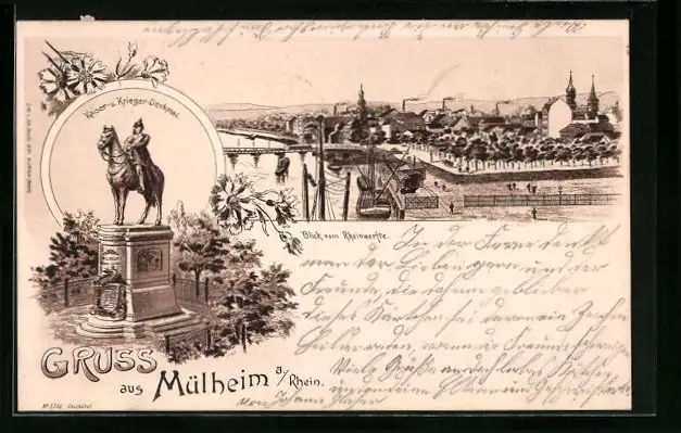 Lithographie Mülheim /Rh., Blick vom Rheinwerfte, Kaiser- und Krieger-Denkmal
