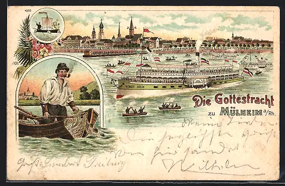 Lithographie Mülheim a. Rh., Gottestracht mit Dampfer Stadt Köln, Fischer im Boot, Segelschiff