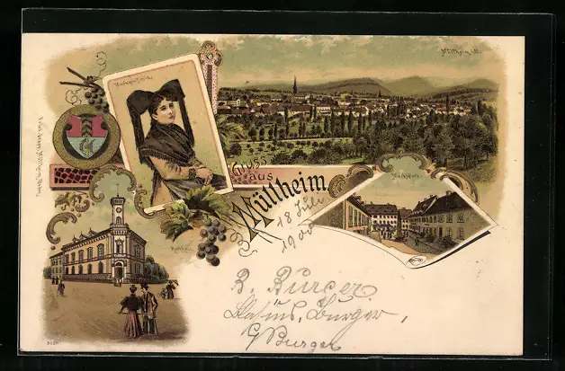 Lithographie Müllheim, Marktplatz, Ortspartie mit Rathaus, Ortsansicht, Markgraflerin, Wappen