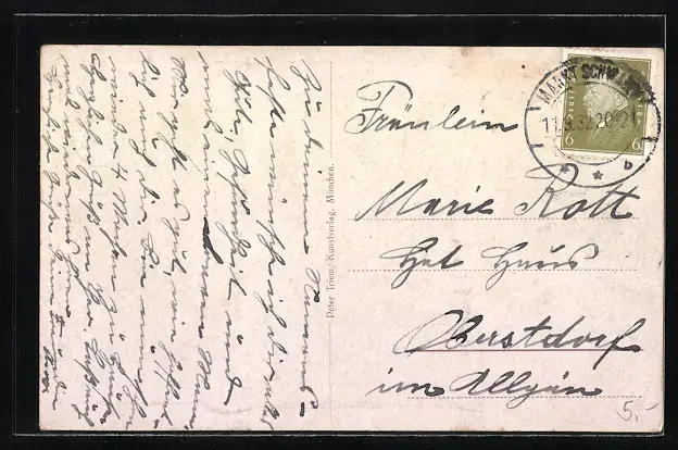 Personenbezogene Daten auf der Rückseite der Karte wurden durch blauen Textmarker unkenntlich gemacht. Die blauen Stellen sind auf die Vorderseite durchgeweicht und wirken sich negativ auf das Postkartenfoto aus