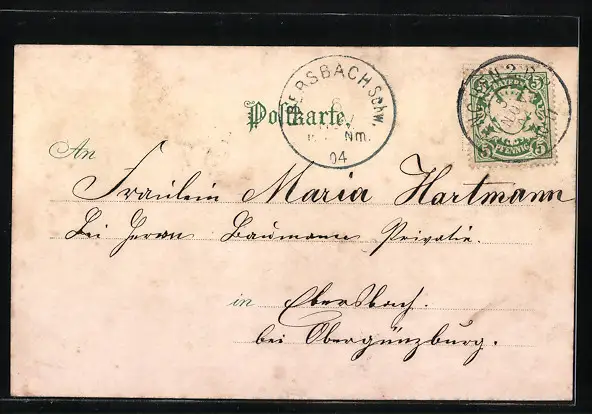 Personenbezogene Daten auf der Rückseite der Karte wurden durch blauen Textmarker unkenntlich gemacht. Die blauen Stellen sind auf die Vorderseite durchgeweicht und wirken sich negativ auf das Postkartenfoto aus