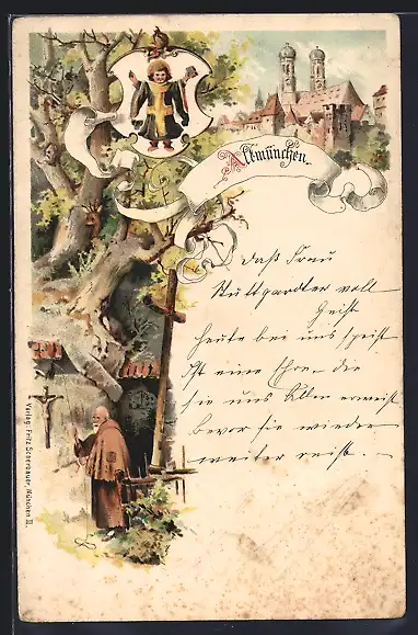 Lithographie München, Altmünchen, Frauenkirche, Einsiedelei, Münchner Kindl