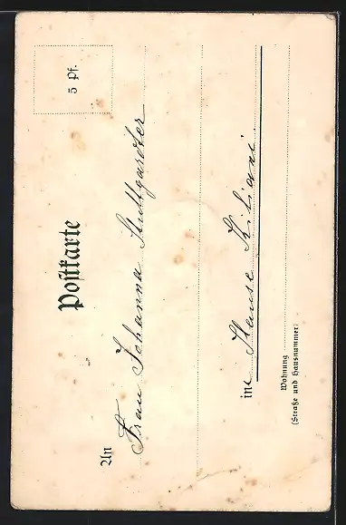 Personenbezogene Daten auf der Rückseite der Karte wurden durch blauen Textmarker unkenntlich gemacht. Die blauen Stellen sind auf die Vorderseite durchgeweicht und wirken sich negativ auf das Postkartenfoto aus