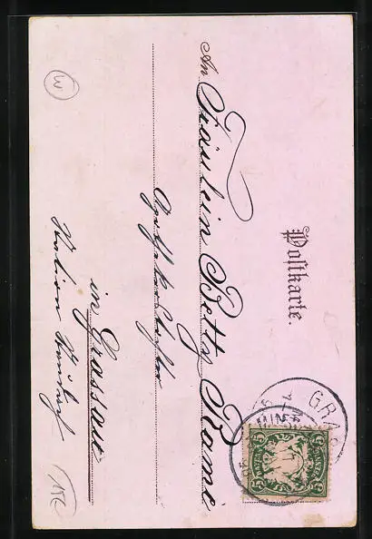 Personenbezogene Daten auf der Rückseite der Karte wurden durch blauen Textmarker unkenntlich gemacht. Die blauen Stellen sind auf die Vorderseite durchgeweicht und wirken sich negativ auf das Postkartenfoto aus