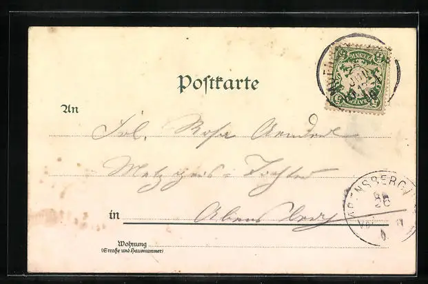 Personenbezogene Daten auf der Rückseite der Karte wurden durch blauen Textmarker unkenntlich gemacht. Die blauen Stellen sind auf die Vorderseite durchgeweicht und wirken sich negativ auf das Postkartenfoto aus