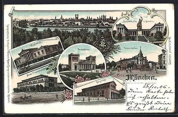 Lithographie München, Basilika, Neue Pinakothek, Ruhmeshalle u. Bavaria