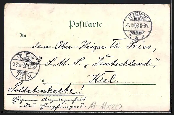 gelaufen 1906, Ecken bestoßen, Eckknicke oben, guter Zustand